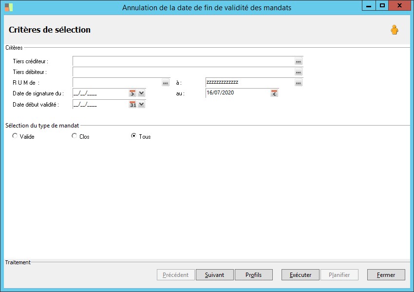 Critère de sélection sur référence mandat pour la suppression des dates de fin d'exécution. |