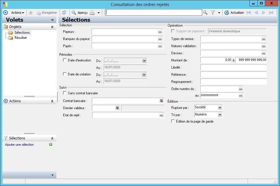 (Sage FRP 1000 Comptabilité) Menu Banque Paiement > Ordres bancaires > Consultation des ordres rejetés