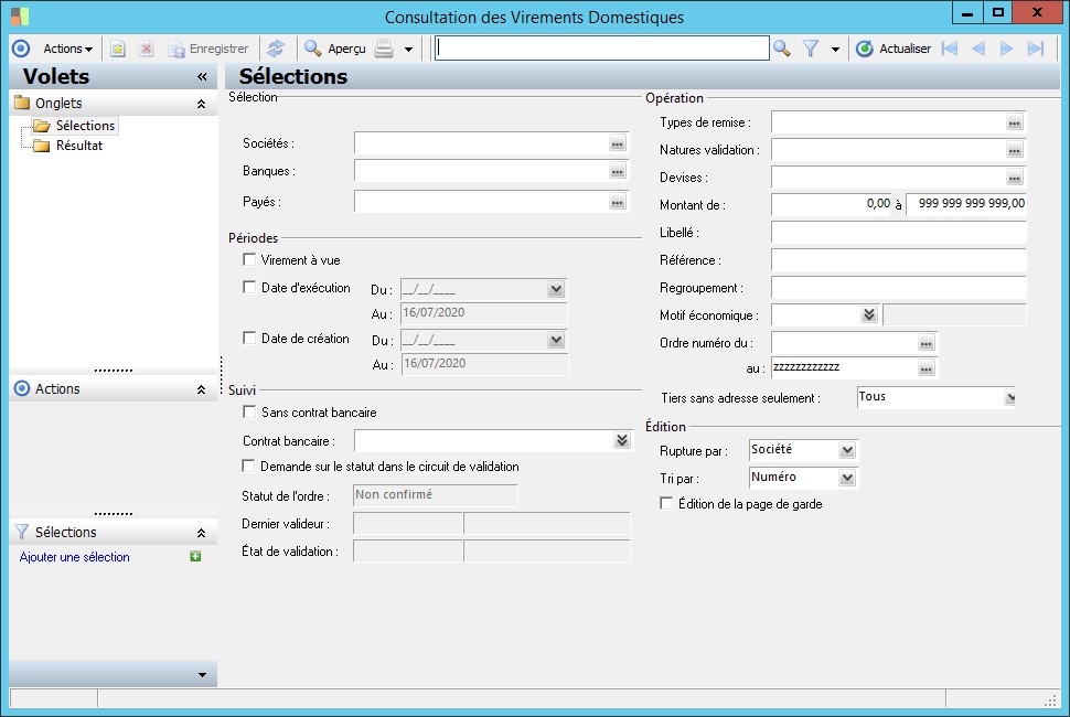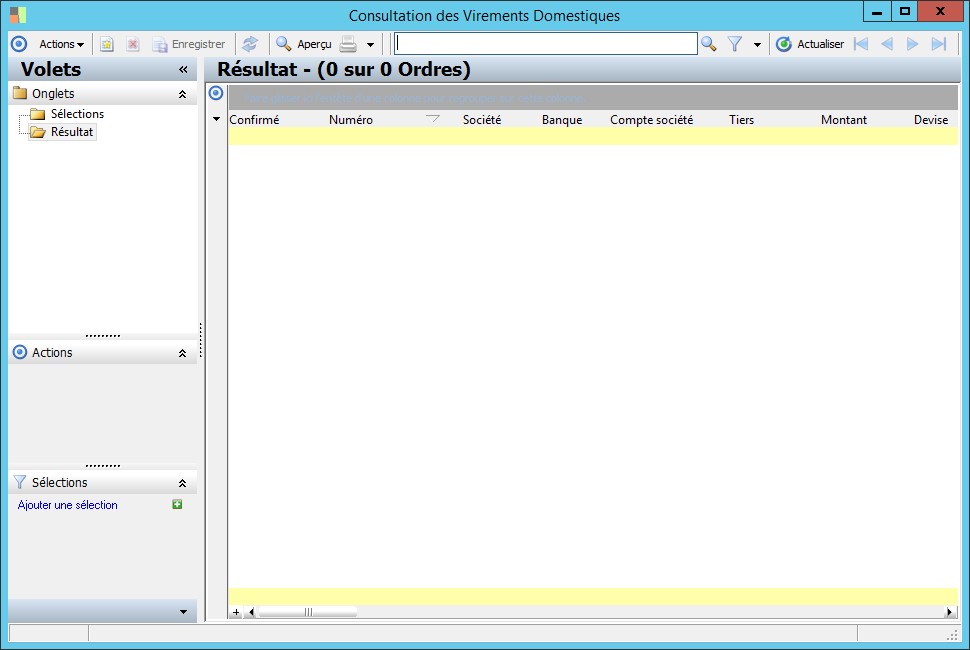 (Sage FRP 1000 Comptabilité) Menu Banque Paiement > Ordres bancaires > Consultation des ordres par type > Consultation des Virements Domestiques