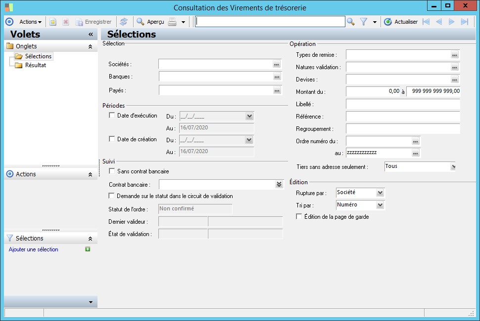 (Sage FRP 1000 Comptabilité) Menu Banque Paiement > Ordres bancaires > Consultation des ordres par type > Consultation des Virements de trésorerie