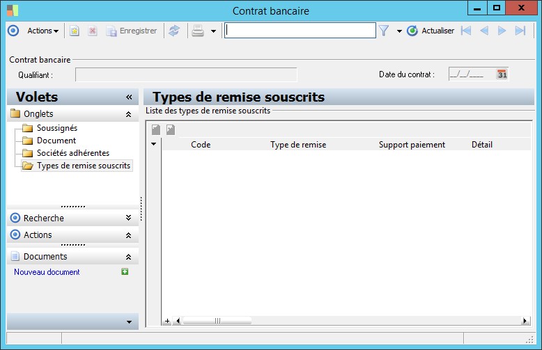 Le bouton Détail ci-contre affiche une nouvelle fenêtre ( Contrat bancaire remise ) permettant de définir les caractéristiques de chaque remise. |