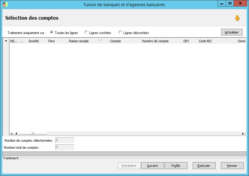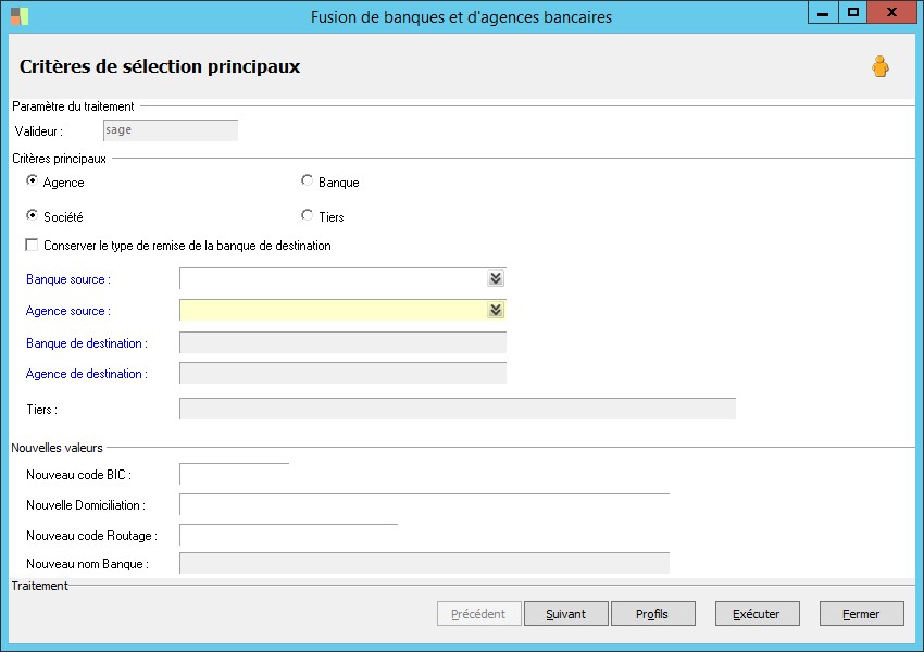 (Sage FRP 1000 Comptabilité) Menu Banque Paiement > Paramètres > Banques > Fusion de banques et d'agences bancaires