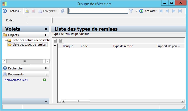 (Sage FRP 1000 Comptabilité) Menu Banque Paiement > Paramètres > Ordres et remises bancaires > Groupe de rôles tiers