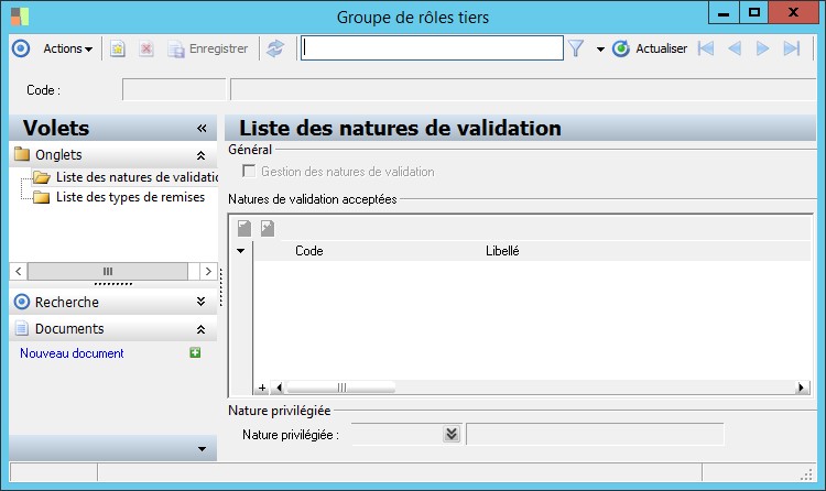 Cette zone représente la nature de validation privilégiée associée au groupe de rôle tiers. Cette information n'est saisissable que lorsque la gestion des natures de validation est activée sur le groupe. |