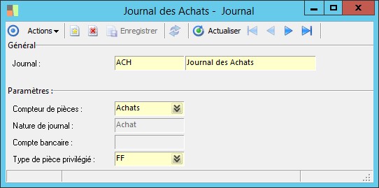 Le code journal permet d'identifier un journal comptable.Le journal doit être rattaché à un compteur de pièce. Ceci permettra d'incrémenter le numéro de pièce à chaque saisie d'une nouvelle pièce sur le journal considéré.On peut également indiquer un compte de contrepartie. Il peut s'agir d'un compte général collectif (client ou fournisseur pour les journaux de nature Vente ou Achat par exemple) ou non collectif (banque pour les journaux de nature Trésorerie). Ce compte général de contrepartie sera proposé par défaut en saisie sur ce journal et pourra être modifié.Si vous ne renseignez pas de compte de contrepartie, il faudra solder manuellement les pièces saisies.Dans Sage 1000 FRP Immobilisations utilisé en autonome, cette notion de compte de contrepartie n'existe pas.Il est possible de rattacher à un journal des fourchettes de comptes interdits. Ces comptes ne pourront pas être sélectionnés en saisie d'écritures comptables.De la même façon, il est possible de définir des fourchettes de comptes privilégiés. Il s'agit des comptes qui seront le plus utilisés sur le journal considéré.Si dans les paramètres comptables, la case "Présentation des comptes privilégiés uniquement en saisie d'écritures" est cochée, l'application présentera par défaut dans tous les écrans de saisie les comptes privilégiés par journal.Cependant, il est toujours possible de visualiser tous les comptes : par un clic droit sur la zone compte dans chacun des écrans de saisie, il suffit de décocher la fonction "Comptes priivilégiés par journal".Dans Sage 1000 FRP Immobilisations utilisé en autonome, ces notions de comptes interdits et privilégiés n'existent pas.Enfin, il faudra associer à un journal un ou plusieurs types de pièce en indiquant un type de pièce privilégié. Ce dernier sera proposé automatiquement en saisie suite au choix du journal.Dans Sage 1000 FRP Immobilisations utilisé en autonome, seul le type de pièce privilégié est à renseigner sur le journal.