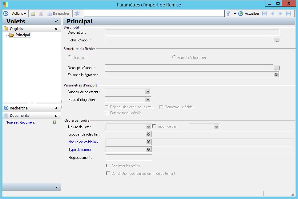 Le mode d'importation définit les données constitutives du fichiers source et les modalités de leur importation :- Ordre par ordre : les données du fichier source sont des ordres intégrés sans constitution de remise.- Remise par remise : les données du fichier source sont des remises.Nota : En intégration remise par remise, il est possible d'importer le détails des remises sans créer d'ordres (cf. Les remises importées présentent le détail des ordres) |