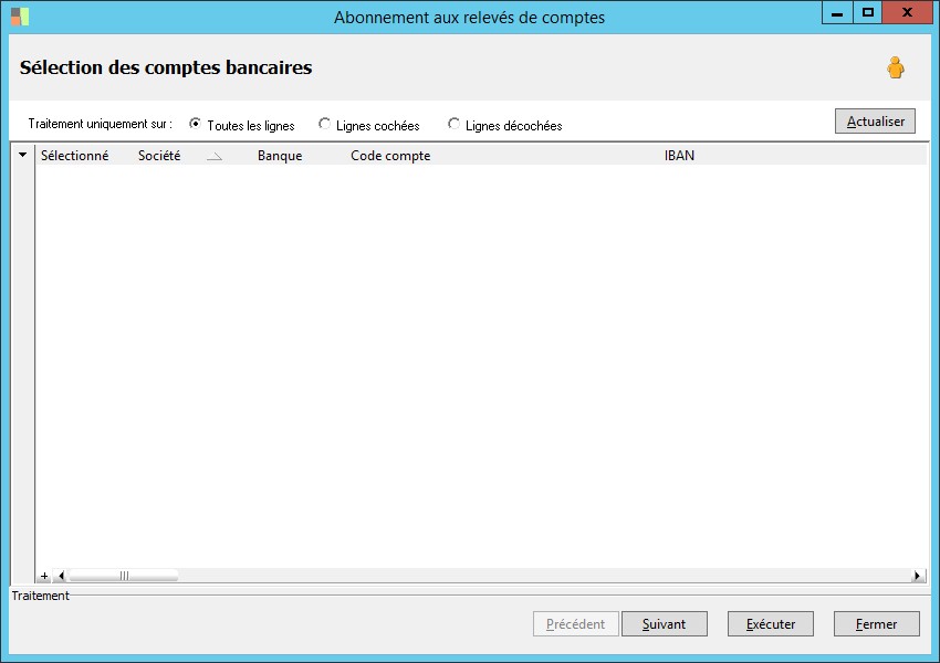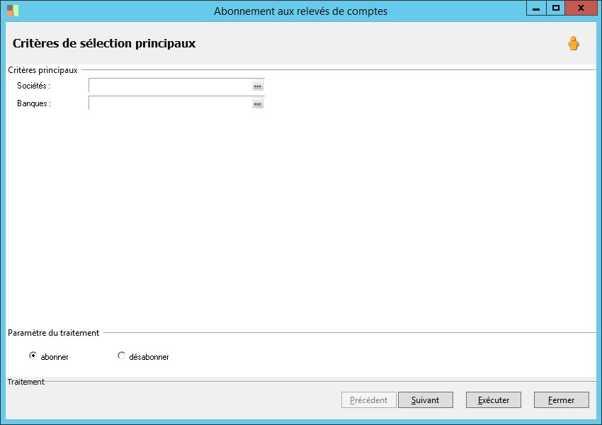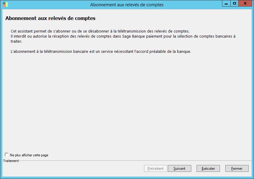 (Sage FRP 1000 Comptabilité) Menu Banque Paiement > Paramètres > Relevés > Abonnement aux relevés de comptes