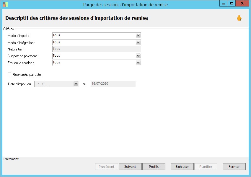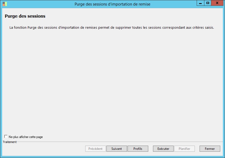 (Sage FRP 1000 Comptabilité) Menu Banque Paiement > Ordres bancaires > Purge des sessions d'importation de remise