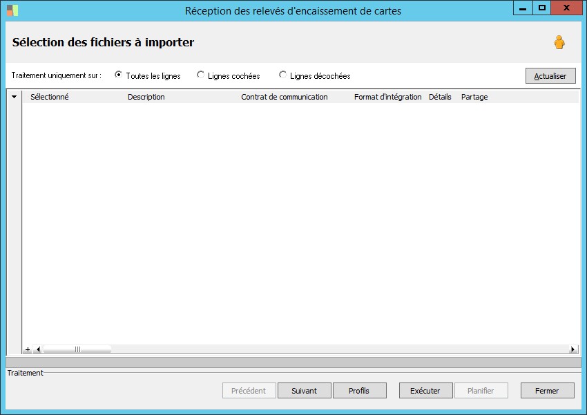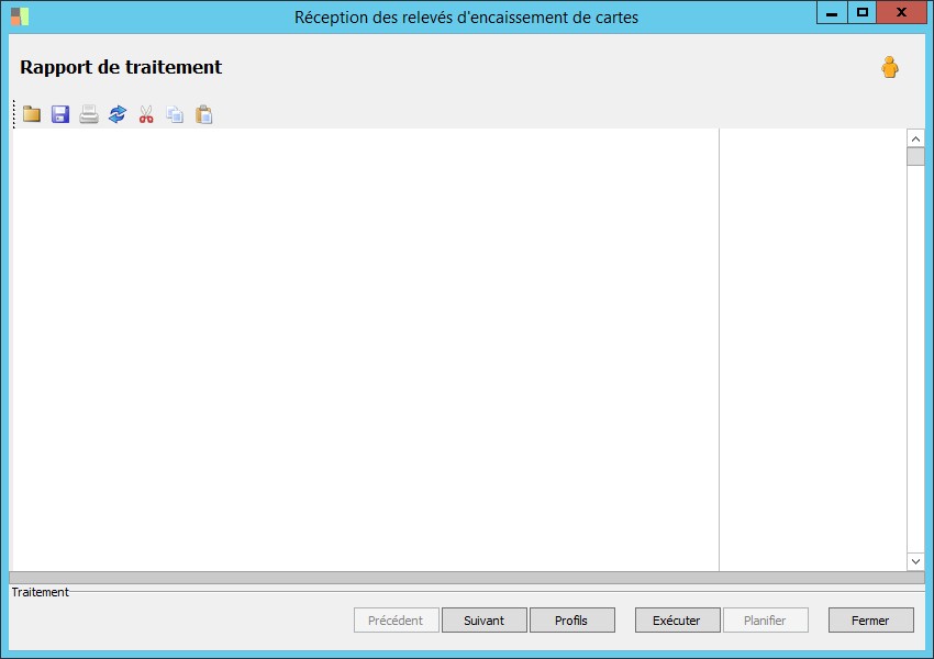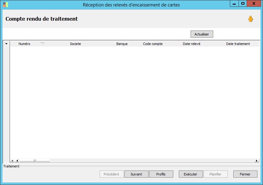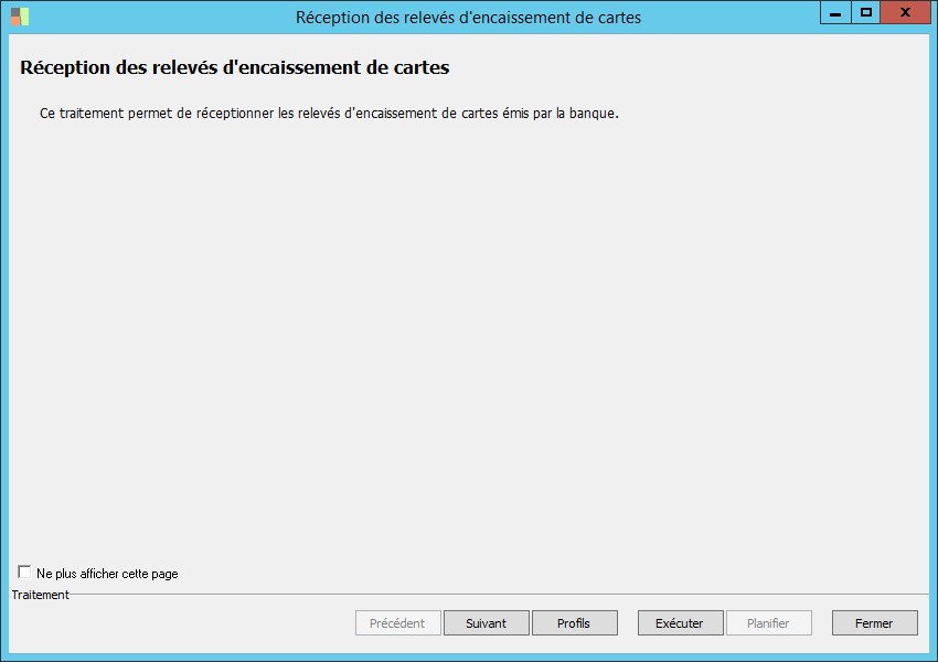 (Sage FRP 1000 Comptabilité) Menu Banque Paiement > Relevés et Notifications > Relevés d'encaissement de cartes > Réception des relevés d'encaissement de cartes