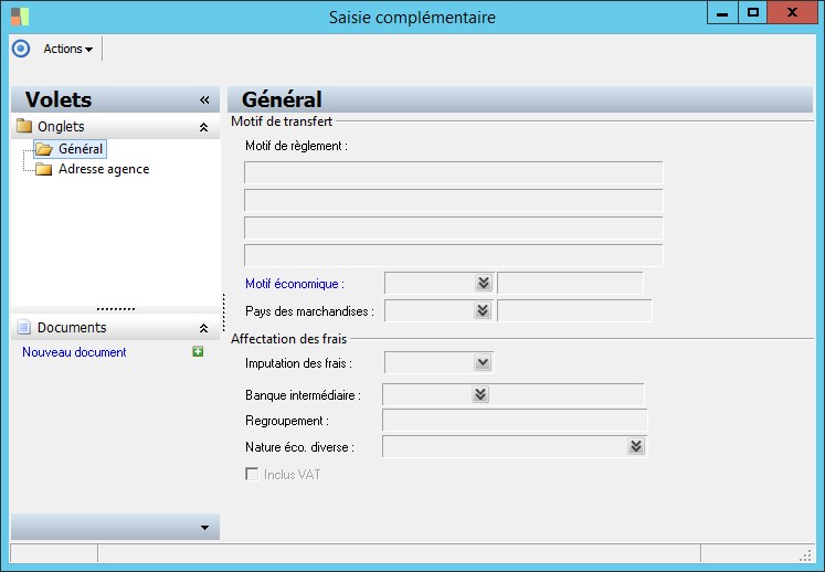 Cette zone mentionne le motif économique pour lequel l'ordre est passé.Le motif économique (également dénommé nature économique) est nécessaire pour la déclarations à la Balance des paiements des ordres passés avec des tiers non résidents.Sont déclarables à la Balance des paiements, les ordres passés avec des tiers non résidents (payeur et payé ne résidant pas dans le même pays) dont le montant de transaction est supérieur ou égal au seuil défini au niveau du pays du tiers non résident.Le motif économique est obligatoire lorsque l'ordre est confirmé et qu'il est déclarable à la Balance des paiements. |