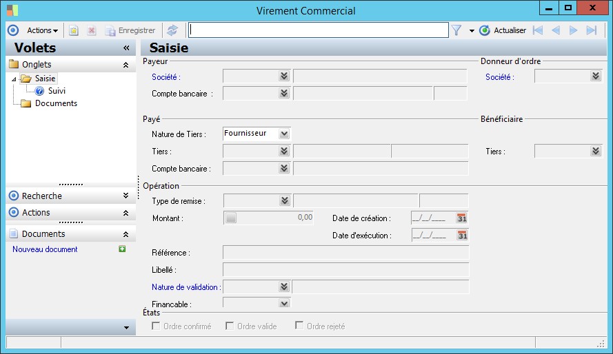 La nature de validation détermine la règle de validation qui sera liée à l'ordre. La nature est elle même déterminée par le groupe de validation associé au rôle du tiers de l'ordre.En l'absence d'une nature de validation, un ordre confirmé est considéré comme valide et peut faire l'objet d'une remise bancaire. |