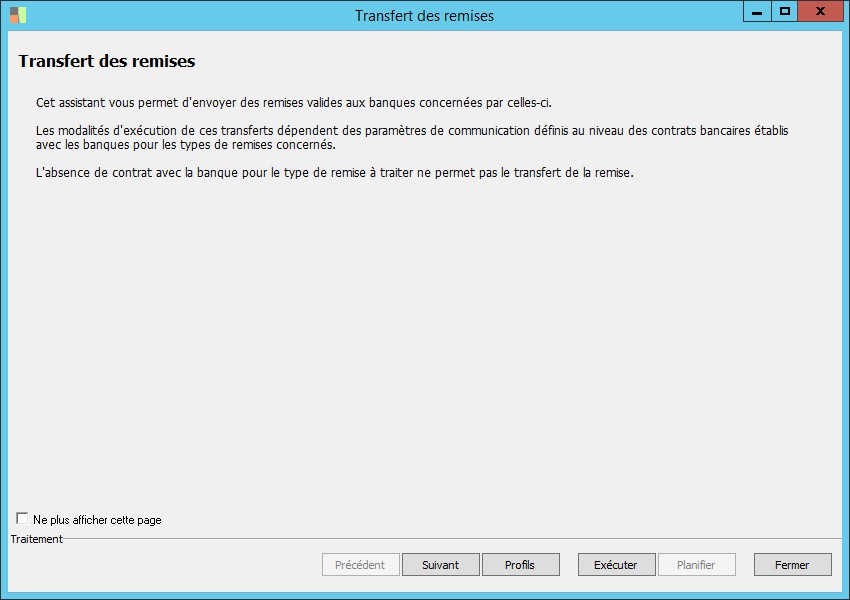 (Sage FRP 1000 Comptabilité) Menu Banque Paiement > Remises bancaires > Transfert des remises