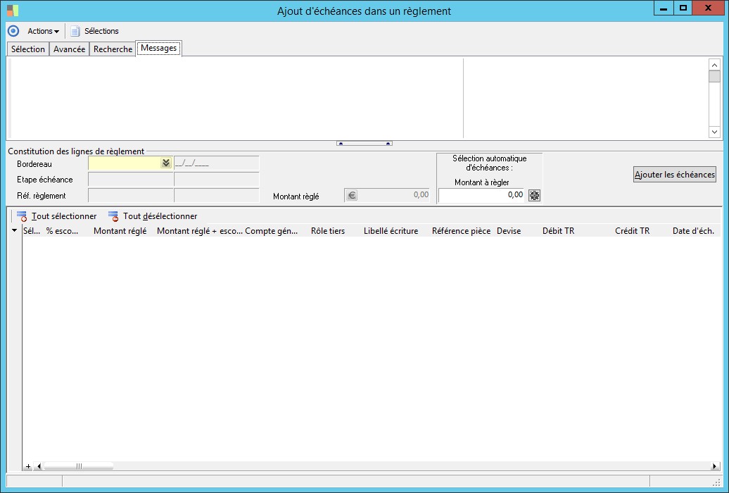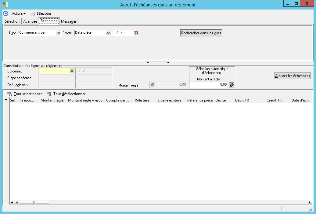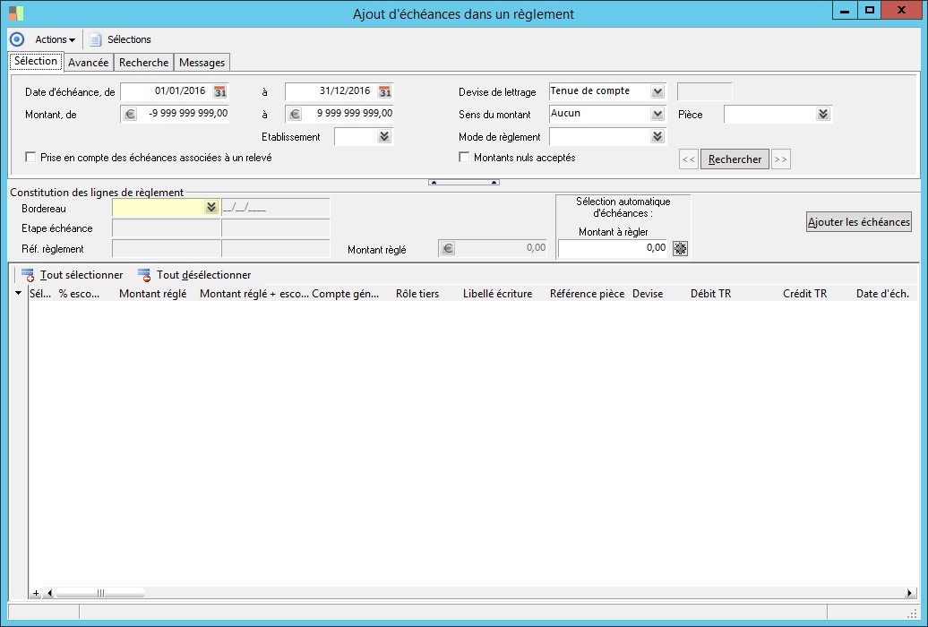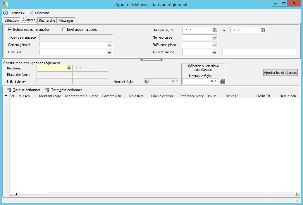 Il est possible de sélectionner les échéances à règler par rapport à la référence de la pièce associée aux échéances. |