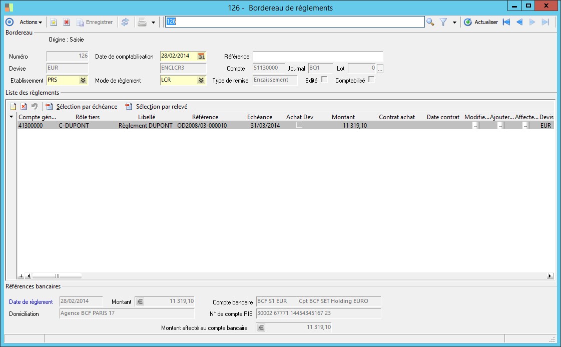 Il s'agit de la date d'échéance du règlement. Elle correspond par défaut à la date de règlement du bordereau et peut être modifiée. |