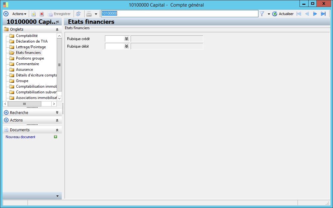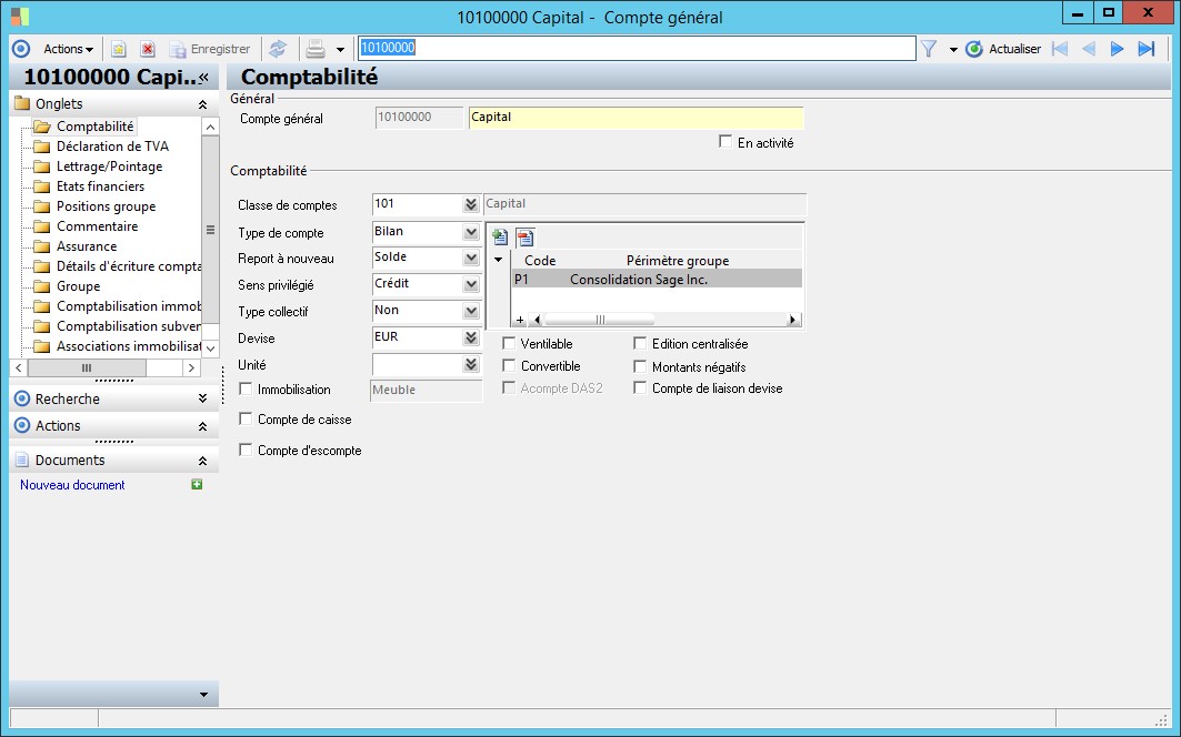 Cette zone vous permet d'indiquer le code unique du compte général correspondant au Plan des Comptes utilisé par votre entreprise. Le code saisi doit correspondre à la structure des codes comptes généraux définie dans les paramètres société. Dans le contexte de la comptabilité, si le code saisi appartient à une fourchette de comptes pour laquelle un profil de compte a été défini, ses valeurs seront proposées par défaut.On associe au compte général une devise privilégiée qui sera proposée par défaut lors de la création d'écritures sur ce compte.Dans le contexte de la comptabilité, on peut aussi associer un compte général à un ou plusieurs périmètres groupes. Ainsi, on pourra effectuer des éditions spécifiques par périmètre groupe (exemple : balance générale).Enfin, il est possible de suivre un compte en quantité. Dans ce cas, il faut indiquer dans quelle unité ces quantités seront exprimées. |