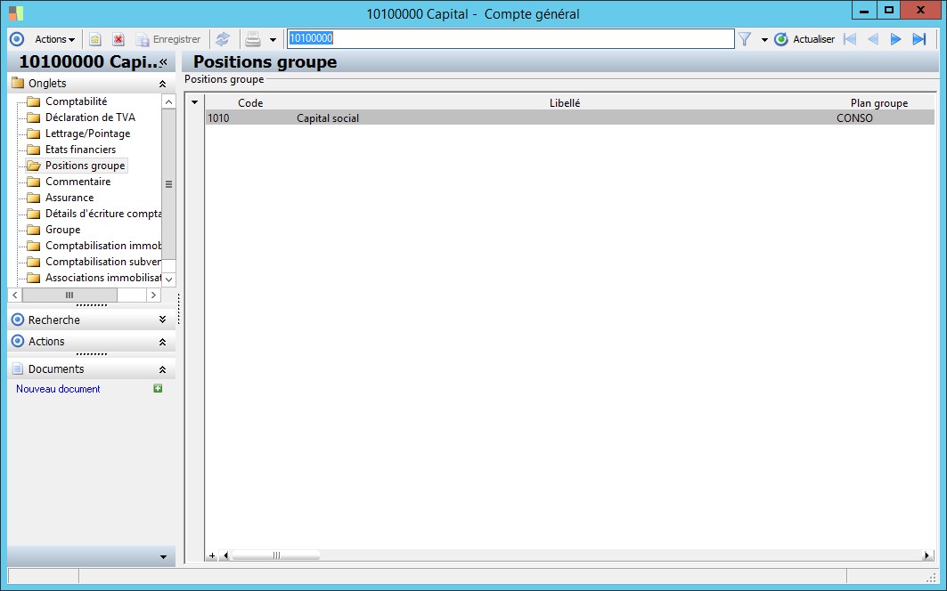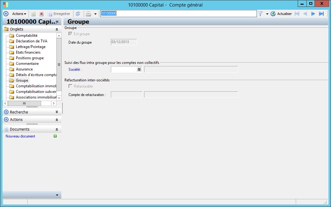 La société permet d'identifier les flux intra-groupe pour les comptes non collectifs. Lors de la création d'écritures sur le compte, si le type de pièce gère le suivi des flux intra-groupe, le code société associé au compte est repris automatiquement sur la pièce comptable. |