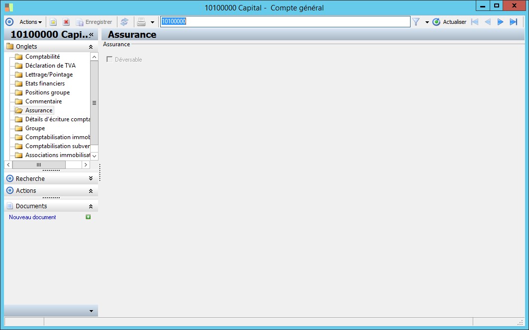 Seuls les comptes déversables peuvent faire l'objet d'un déversement assurance.Un compte général peut être rendu déversable si :- la nature du compte est "autre"- s'il ne s'agit pas d'un compte collectif |