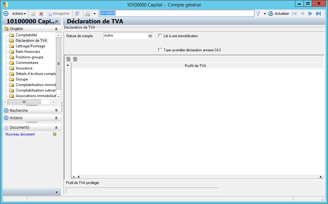 L'attribut nature de compte précise les relations entre le compte général et la TVA lorsque ce compte est lié à la gestion de la TVA. On a le choix entre plusieurs natures:- TTC : cette nature s'applique plus particulièrement aux comptes collectifs (par ex. : clients, fournisseurs)- HT : cette nature s'applique aux comptes de bilan ou de gestion (immobilisations, classe 6 et 7) -TVA : cette nature s'applique aux comptes enregistrant la TVA.- Autre : pour tous les comptes ne permettant pas de gérer la TVA.Si la nature du compte est HT, il faut obligatoirement indiquer un ou plusieurs profils de TVA (dont un déclaré privilégié). Dans le contexte de la comptabilité, ce profil de TVA permettra le calcul et la comptabilisation automatique de la TVA en saisie. |