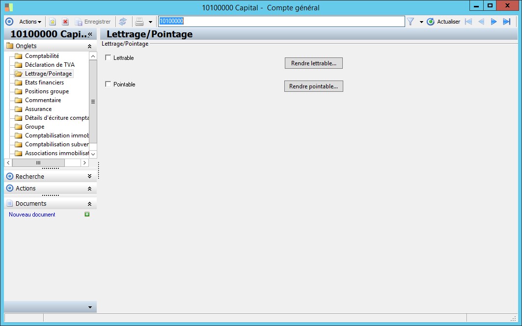 Un compte général doit être déclaré pointable s'il est pertinent de permettre une sélection (totale ou partielle) de ses mouvements à des fins de rapprochement bancaire. Un compte ne peut pas être simultanément lettrable et pointable. Un compte déclaré pointable doit obligatoirement être rattaché à un compte bancaire établissement et à un compteur de pointage. |