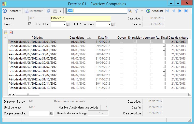 Le code identifie l'exercice de façon unique.Les exercices utilisent les périodes de la dimension temps préalablement créée.On peut avoir autant d'exercices que nécessaire, dans la limite de la dimension temps. |