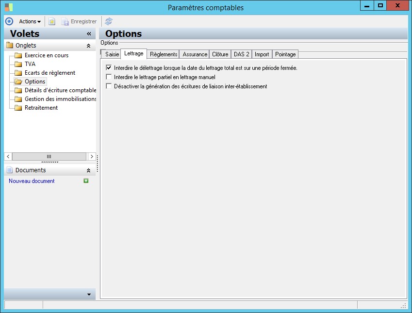 Cette option permet de désactiver la génération automatique des écritures de liaison inter-établissements lors d'un lettrage, ou dans le cas d'un traitement générant du lettrage, lorsque les échéances lettrées concernent des établissements différents.Cette option est modifiable et concerne les traitements suivants :- Lettrage automatique / manuel- Evolution des échéances automatique / manuelle- Comptabilisation des bordereaux de règlements |
