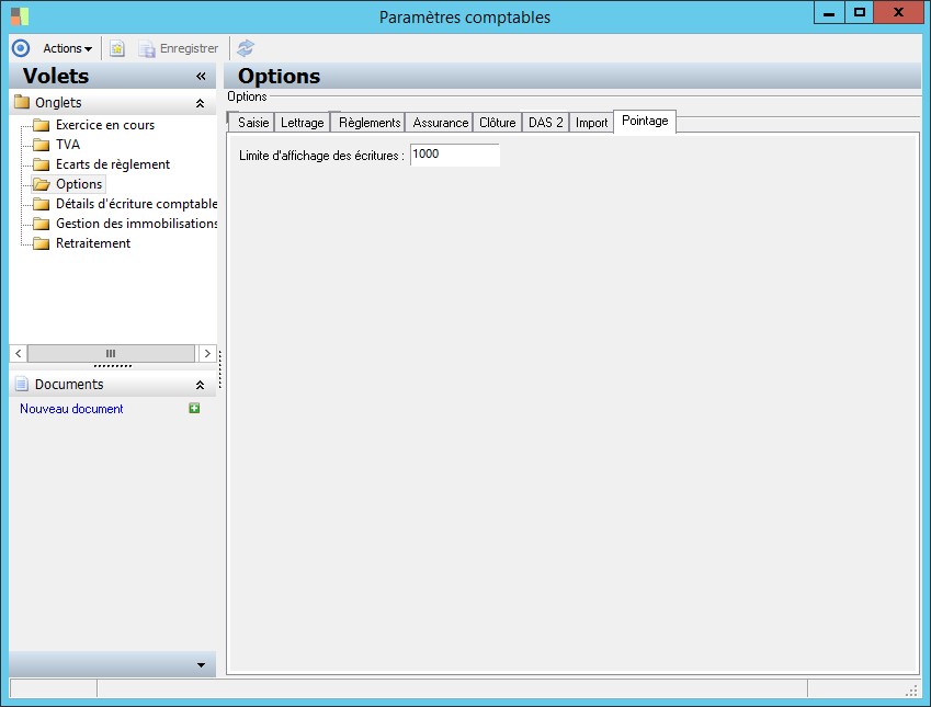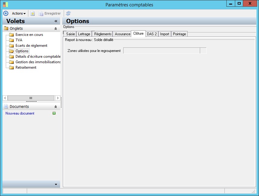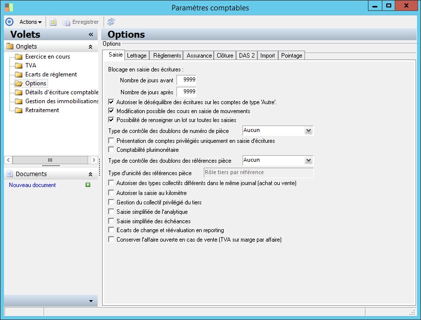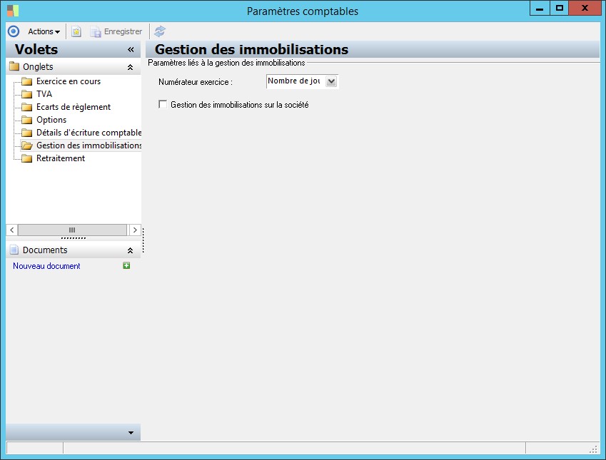 Dans la fenêtre Paramètres comptables, la présence des fonctions décrites dans ce contexte dépend des applications installées. |