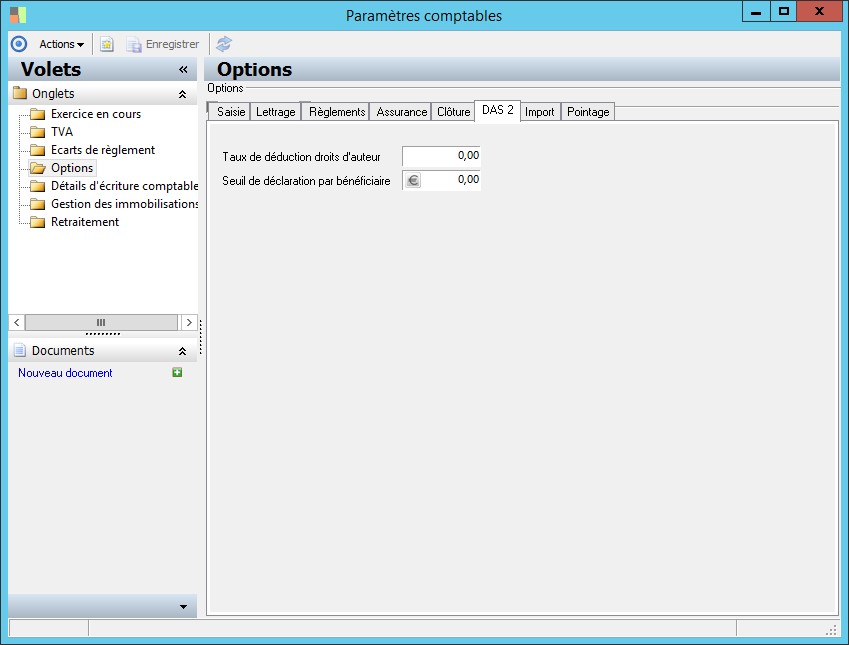 Cette zone permet de renseigner un seuil par bénéficiaire pour la déclaration DAS 2. Ce seuil est exprimé en devise de tenue de compte. Un rôle tiers donné ne figurera dans la déclaration que si les sommes à déclarer tous établissements confondus pour la période de déclaration sont supérieures au seuil renseigné. |