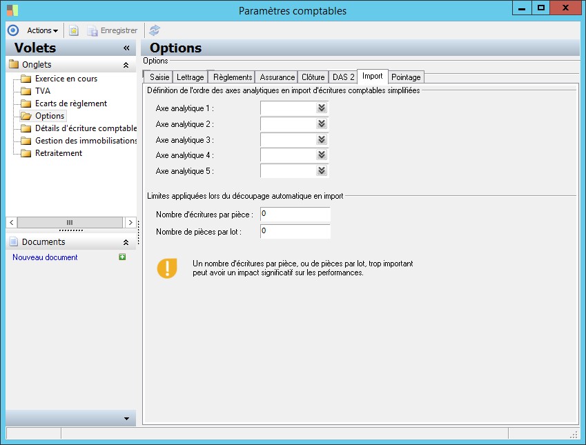 Cette zone permet d'indiquer le nombre limite de pièces par lot au delà duquel un nouveau lot doit être créé lors du découpage automatique des lots en import d'écritures comptables sur un journal ayant une nature différente de Achat ou Vente. Une valeur égale à zéro équivaut à appliquer la limite standard de 500. |