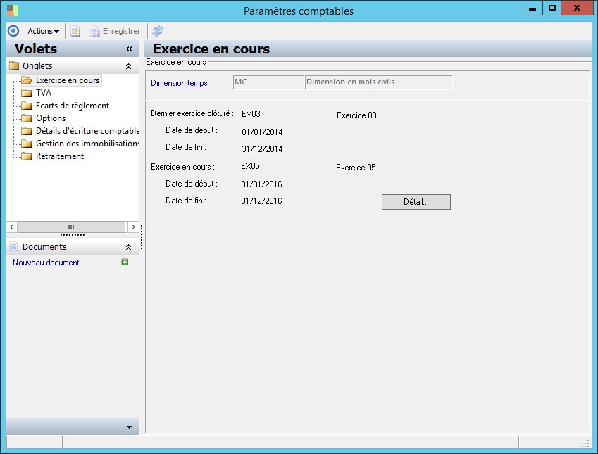 La dimension temps définie dans les paramètres comptables détermine quel est le découpage des périodes constituant les exercices comptables. Une fois choisie, cette dimension temps n'est pas modifiable. |