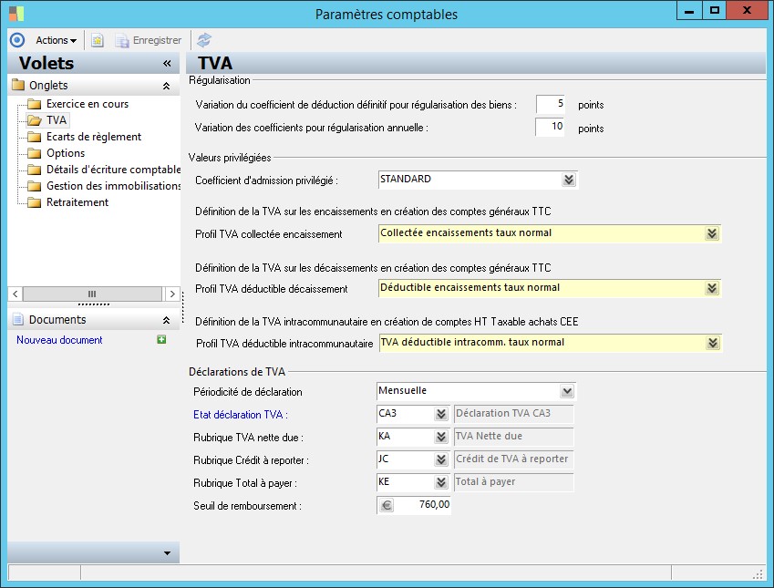 Le profil TVA déductible intracommunautaire est affecté automatiquement lors de la création de comptes généraux HT ayant une base de TVA déclarée en "Taxable achat CEE". |