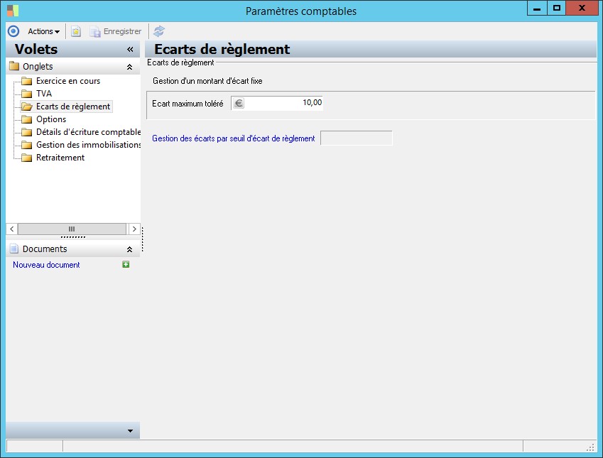 Cette zone détermine l'écart maximal autorisant la génération automatique d'écritures d'ajustement lors des opérations de lettrage dans le cadre de la gestion des écarts de règlement par montant fixe.La définition des écarts s'effectue en effet soit de façon unique (un écart toléré en terme de montant fixe), soit de façon multiple (plusieurs écarts par seuil de règlement).Ces seuils sont exprimés en montant et pour chacun des seuils, il faut renseigner un écart en pourcentage. Ces 2 modes de gestion des écarts de règlement sont exclusifs l'un de l'autre. |