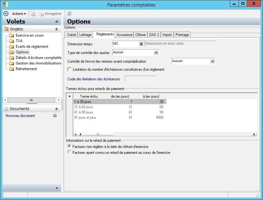 Cette option permet de définir le niveau de contrôle des quotas bancaires lors de la création des bordereaux de règlement. |