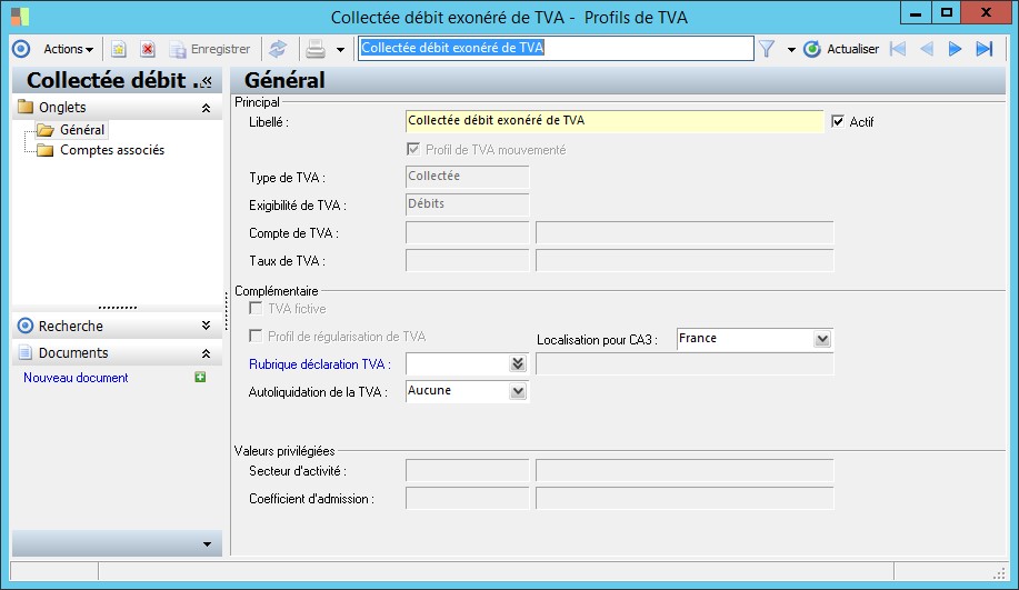 Si cette case est décochée, cela signifie que le profil de TVA est inactif : dans ce cas, il est impossible de saisir ou d'importer des écritures sur ce profil de TVA. |