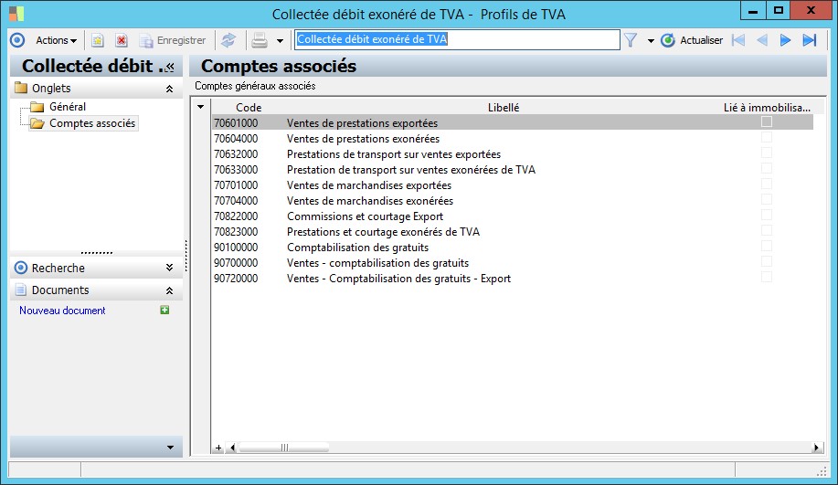 Le type de TVA détermine s'il s'agit de la TVA déductible ou collectée. Les comptes de HT et de TVA associés au profil doivent être de même type que le type de TVA du profil.Le statut intracommunautaire de la TVA n'est saisissable que lorsque la TVA est déductible.De même, un profil de TVA fictive ne peut être que de type déductible.Un profil de TVA de type marge peut être associé aussi bien à des comptes de HT ayant pour type de TVA déductible, collectée ou marge.La TVA sur marge est un régime particulier pour lequel la TVA est calculée sur la marge, c'est-à-dire la différence entre le prix de vente et le prix d'achat d'un bien, sur laquelle on applique le taux de TVA du profil afin de calculer la TVA dûe. |