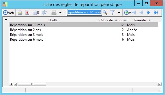 permet de créer la règle de répartition. Saisir dans la colonne libellé Mensuelle sur 1 an, ensuite indiquez 12 dans la colonne Nombres de périodes puis sélectionnez, la périodicité.