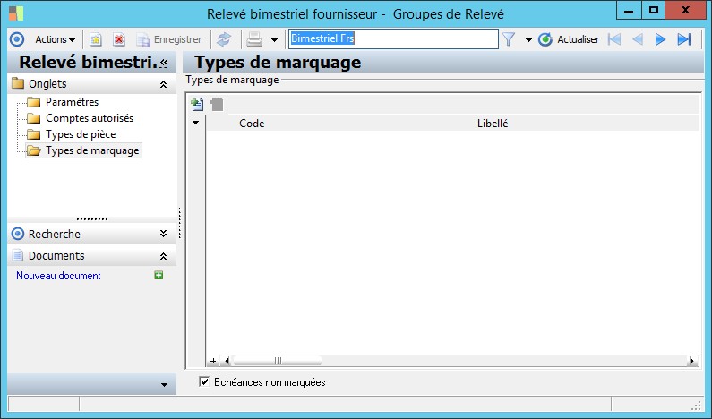Le code "Type de marquage" permet d'identifier de manière unique le type de marquage.Le marquage est une information extra-comptable, qui intervient indépendemment soient sur les écritures comptables, soient sur les écritures d'échéances (ex : bon à payer, ...).C'est un critère de sélection des écritures lors de consultation ou d'édition.Le marquage correspond essentiellement à annoter les écritures en vue d'un traitement à posteriori (révision comptable, écriture litigieuse...). |