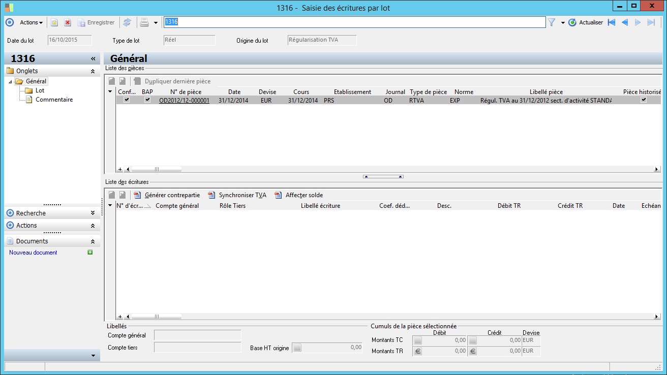 Chaque lot est numéroté. Les formats des compteurs des lots et des écritures sont numériques et non modifiables. Seul le compteur des pièces est paramétrable par le journal. Tous les compteurs sont incrémentés automatiquement. Le compteur des lots est commun aux écritures de brouillard et de simulation. Si un lot est créé et que les pièces ne sont ni validées ni supprimées, le numéro du lot n'est plus disponible. |