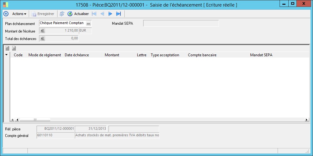 (Sage FRP 1000 Comptabilité) Menu Comptabilité Groupe > Fichiers de base > Saisie de l'échéancement [ Ecriture réelle ]
