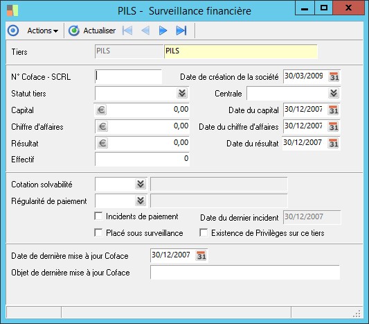 Cette zone permet de renseigner la date de dernière mise à jour Coface - SCRL.Cette zone peut notamment être mise à jour automatiquement lors des connexions au Serveur Coface via le Portail Sage pour la surveillance financière du tiers. |
