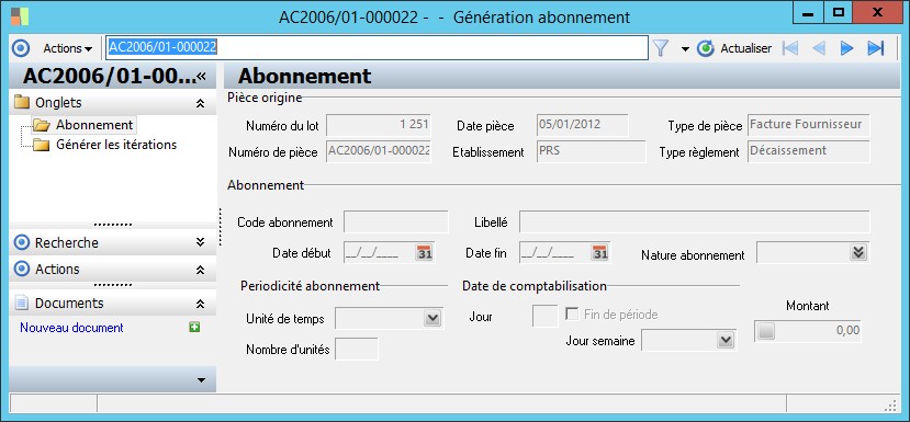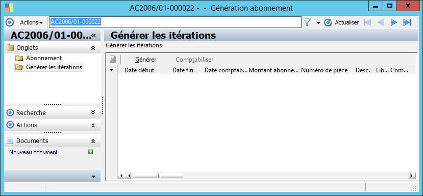 (Sage FRP 1000 Comptabilité) Menu Comptabilité > Générale > Saisie des écritures en brouillard > Exploitation > Génération abonnement