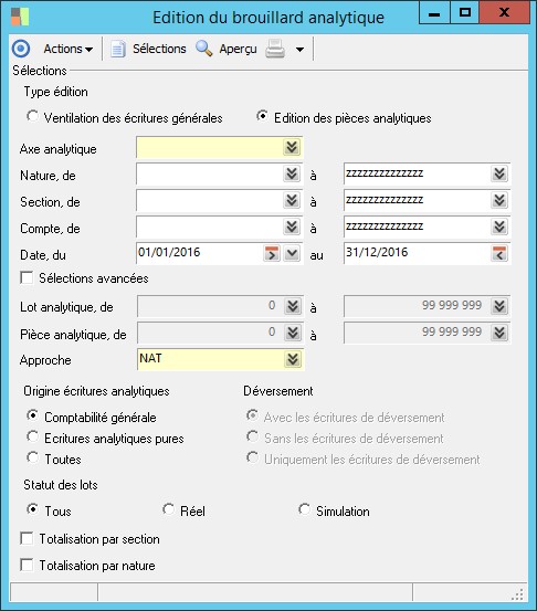 Cette zone est accessible uniquement lorsque le type d'édition 'Edition des pièces analytiques' est sélectionné, elle permet de réaliser une totalisation des écritures analytiques par nature.