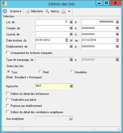 (Sage FRP 1000 Comptabilité) Menu Comptabilité > Générale > Editions comptables > Edition des lots