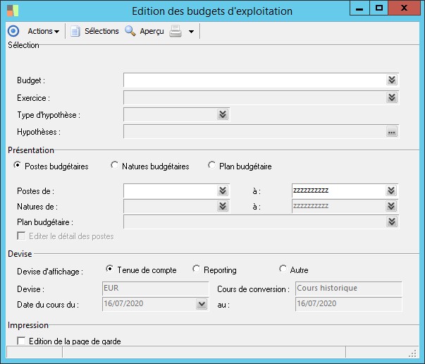 L'édition présente par poste, nature ou plan budgétaire et par dimension temps (ex : par mois) le montant budgété en fonction du budget et del'hypothèse sélectionnée.