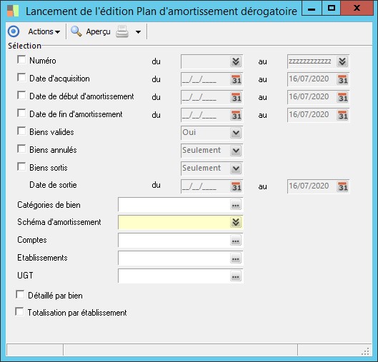 Ce paramètre permet de faire une sélection sur la date de début d'amortissement (si la case est cochée).
