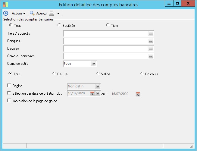L'édition détaillée des comptes permet de visualiser, pour chaque compte bancaire, sa date de création, son statut et l'opérateur responsable de sa création.