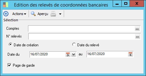 L'édition des relevés de coordonnées bancairespeut être filtrée par comptes bancaires, numéros de relevés, datesde réception et datesde création. Pour consulter les relevés, cliquer sur le bouton Aperçu . Pour les imprimer, sélectionner Imprimer dans le menu de l'icône Imprimante.