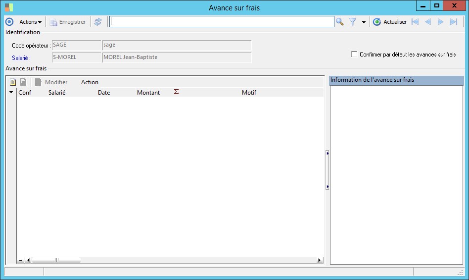 L'avance sur frais est saisie pour un salarié donné. Par défaut, le salarié lié à l'opérateur est proposé.Il est possible de modifier le salarié dans les lignes de saisie des avances sur frais. |