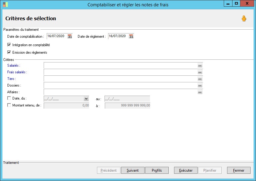 Cet écran permet de renseigner des critères de sélection des notes de frais à régler.
