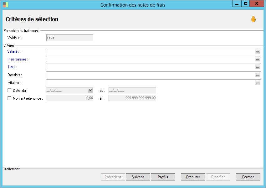 Cette fonction permet de confirmer les notes de frais dans le cas d'un traitement de masse. Elle est lancée à partir de la fonction