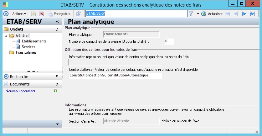 Pour un axe avec constitution automatique du code section, cette zone permet d'indiquer une valeur de texte qui sera reprise en tant que centre par défaut lorsqu'aucune valeur de centre d'achat ou d'engagement n'aura été trouvée. Plus précisément, la valeur de cette zone sera reprise sous les conditions suivantes :Pour une commande achat- Lorsque la valeur du centre achat est renseignée mais n'est pas trouvée- Lorsque la valeur du centre achat n'est pas renseignée mais qu'un code section est généré par le biais d'un autre plan de l'axe. Pour un détail d'engagement- Lorsque la valeur du centre engagement est renseignée mais n'est pas trouvée- Lorsque la valeur du centre engagement n'est pas renseignée mais qu'un code section est généré par le biais d'un autre plan de l'axe ayant une valeur de centre d'engagement renseignée et trouvée.La concaténation des centres des plans analytiques ayant un centre analytique défini en engagement constituera le code analytique du détail d'engagement. Pour constituer la section analytique de la commande d'engagement, ce code analytique sera complété le cas échéant des valeurs de plans n'ayant pas de centres d'engagement définis lors de la génération de la commande d'engagement. Le code section du détail d'engagement présente l'information du code section provisoire de la commande, c'est-à-dire du code analytique complété des valeurs de centre d'attente-par défaut pour les plans analytiques n'ayant pas de centres d'engagement définis. S'agissant d'une information provisoire, elle n'est pas présentée en standard dans l'écran de l'analytique du détail engagement.Ce code analytique peut être considéré comme définitif lorsque la chaîne d'achat n'est pas utilisée, particulièrement au niveau de la génération de commande achat. Dans ce dernier cas, il pourra être intéressant de ne pas renseigner une valeur de centre d'attente-valeur par défaut qui corresponde au centre d'attente du plan analytique mais de renseigner une valeur de centre différente (cf. remarque 2 ci-dessous).Rappel : l'analytique du détail d'engagement est généré au moment de la création de sa proposition d'achat. Pour une commande d'engagementPour une commande d'achat issue des engagements, la valeur de centre du plan est reprise tel quel de l'analytique de l'engagement (code analytique) et n'est pas modifiée dans tous les cas. Seules les informations de centre d'attente-valeurs par défaut des plans n'ayant pas de centres d'engagement définis sont remplacées au niveau du code section provisoire par la valeur du centre d'achat lorsque défini. A défaut d'être trouvée, c'est l'information de la valeur de centre d'attente-valeur par défaut existante au moment de la génération de commande qui s'applique lorsque définie. Veuillez cependant noter les points suivants lors de votre paramétrage d'axe analytique.1) La valeur du "Centre d'attente (Valeur par défaut lorsqu'aucune information n'est disponible)" est une valeur qui ne s'applique que lorsqu'un code section doit être constitué, c'est-à-dire que lorsqu'il existe au niveau de l'axe au moins un plan analytique ayant une valeur d'attribut renseignée au niveau de l'une des zones "Information reprise en tant que valeur de centre analytique en achat" ou "Information reprise en tant que valeur de centre analytique en engagement". Aucun code section ne sera généré sur l'axe lorsque tous les plans analytiques mentionneront une valeur de centre d'attente sans attributs mentionnés sur les 2 zones précitées ou l'une seule (selon contexte d'utilisation ou non des engagements ou de la chaîne achat au niveau de votre société).2) Il est préconisé d'indiquer la valeur de centre d'attente éventuellement définie au niveau de l'axe dans la mesure où il sera peu fréquent qu'une valeur de centre analytique en achat et en engagement ne soit pas trouvée. Il peut être néanmoins intéressant d'indiquer une valeur ne correspondant pas au centre d'attente dans le cadre où l'une des informations reprise en tant que centre analytique pour les achats ou les engagements ne sera pas définie.Ainsi et par exemple, il pourra être intéressant de définir une valeur de centre par défaut égale à MAG (Magasin) pour un plan analytique Service n'ayant pas de valeur définie de centre analytique pour les achats mais en ayant une pour les engagements : Tous les achats n'étant pas issus des engagements seront réputés effectués sur le centre MAG (Ce qui évite un retraitement du centre d'attente) tandis que les achats issus des engagements reprendront en tant que centre le code Service du demandeur.La reprise du centre par défaut ainsi défini s'effectuera uniquement sous les conditions évoquées au niveau de la remarque nb1.3) Lorsqu'une information de centre analytique pour les engagements est paramétrée au niveau du plan analytique et qu'aucune valeur de centre d'attente n'est renseignée, le code section peut être constitué de façon partielle lors du traitement de génération des propositions d'achat si la valeur retournée par l'attribut choisi au niveau de centre pour les engagements est vide.Ce sera par exemple le cas si vous indiquez un attribut basé sur le produit renseigné au niveau de la demande d'engagement et que l'utilisateur ne renseigne pas de produit (zone optionnelle par défaut)Ce fonctionnel est partiellement contrôlé au moment du paramétrage de l'axe analytique avec le message d'alerte suivant (Exemple) :Attention : La zone "Information reprise en tant que valeur de centre analytique en engagement" du plan Famille de l'axe analytique ETS(Equivalence des unités) est renseignée alors qu'aucune valeur n'est définie au niveau de la zone "Centre d'attente". Les commandes d'achat issues des engagements auront leurs codes section partiellement générés si aucune valeur n'est trouvée en tant que centre pour les engagements. Pour avoir un code section compl